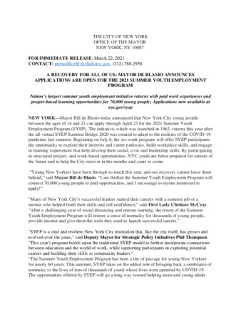 Nyc Government Publication Mayor S Press Release Mayor De Blasio Announces Applications Are Open For The 2021 Summer Youth Employment Program Id 4t64gq47m Government Publications Portal